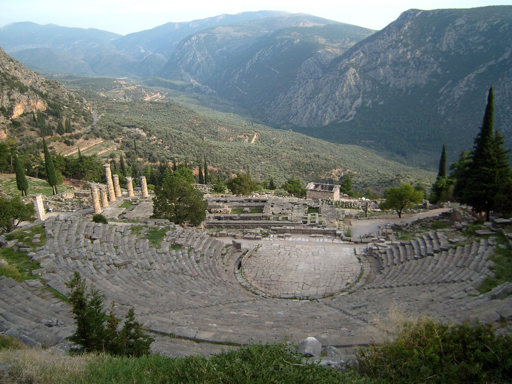 "Nous y sommes ! Au pied du mont Parnasse et sous les rayons doux du soleil couchant, se dressent le temple d'Apollon, l'Amphithéâtre, le Stadium, sans compter bien d'autres merveilles jalousement gardées dans le musée tout proche. A l'époque de la Grèce antique, ce très haut lieu, était considéré comme le "nombril du monde". Ici le temps s'est figé, et dans ce cadre millénaire on imagine un peuple voué aux oracles d'Apollon, participant aux célébrations religieuses et acclamant avec ferveur les athlètes qui livraient compétition au sein du Stadium.
