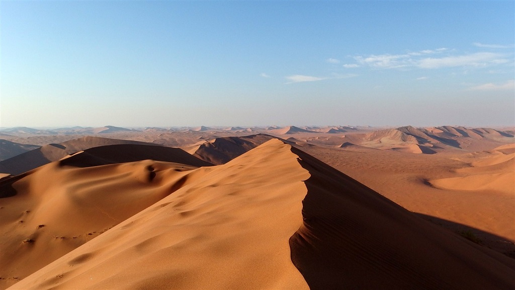 A quelques centaines de kilomètres de là, la terre ocre rougit sous le soleil. Le vent souffle sur le désert du Namib, qui s'étend sur toute la côte ouest du pays. On le considère parfois comme le plus vieux désert du monde. Aride, sec, il trace ses sillons sur plusieurs milliers de kilomètres.