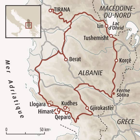 Nous découvrons l’Albanie à travers ses montagnes, vallées et rivages méditerranéens, dans un voyage où nature et rencontres rythment nos journées. Ce circuit s’adresse aux voyageurs curieux, qui aiment marcher, s’évader et explorer à leur rythme des paysages variés et authentiques. De Korçë à Përmet, nous pénétrons la vie rurale, visitons une ferme familiale et participons à un atelier de cuisine locale. Les gorges de Langarica et les sources thermales de Benjë éveillent nos sens, tandis que Gjirokastër et Berat nous plongent dans l’artisanat et le patrimoine albanais. Sur la Riviera, nous naviguons vers des criques tranquilles, randonnons entre oliveraies et villages perchés, et profitons de panoramas mêlant mer et montagne, avant de rejoindre Tirana, enrichis de paysages, de culture et de rencontres authentiques.