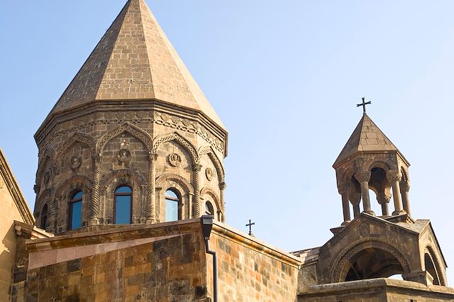 Nous rejoignons Etchmiadzine, considérée comme le cœur spirituel de l’Arménie. La cathédrale d’Etchmiadzine, classée au patrimoine mondial de l’UNESCO, occupe une place centrale dans l’histoire du christianisme. Édifiée au IV? siècle puis remaniée au fil du temps, elle demeure un symbole fort de l’identité religieuse du pays. L’atmosphère y est sobre, presque recueillie, propice à la compréhension de l’ancrage spirituel arménien. À quelques kilomètres, les ruines de Zvartnots complètent la visite. Cette cathédrale du VII? siècle, également inscrite à l’UNESCO, impressionne par l’audace de son architecture et la finesse de ses sculptures. Entre colonnes élancées et chapiteaux ornés, le site illustre la créativité des bâtisseurs arméniens et offre une lecture claire du patrimoine médiéval du pays. Retour à Erevan pour un dîner d'adieu.