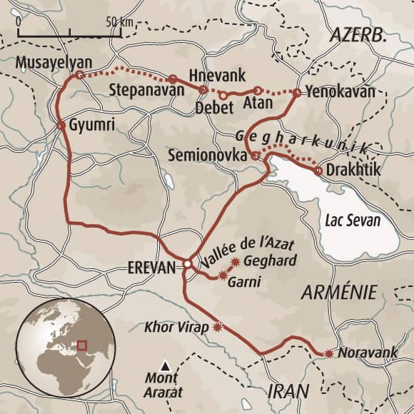 Depuis Erevan, nous prenons la direction du nord-ouest pour rejoindre Gyumri, ville élégante au caractère affirmé. L’itinérance à vélo s’installe ensuite dans les régions de Lori et Tavush, entre forêts fraîches, gorges minérales et villages agricoles, ponctuée de rencontres en maisons d’hôtes. Plus loin, le lac Sevan s’impose comme une respiration en altitude, vaste étendue lumineuse. Le voyage s’achève par la découverte des sites emblématiques, de Garni et ses orgues de basalte au monastère de Gueghard, puis Khor Virap et Noravank, posés dans des paysages minéraux baignés de lumière.