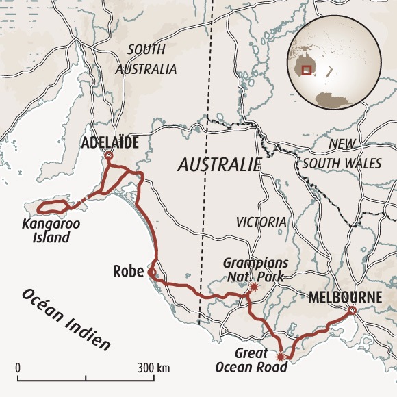 Départ pour un splendide roadtrip dans le sud en totale autonomie ! Observation d'une faune rare sur l'île de Kangaroo (kangourous, koalas, wallabies, phoques, lions de mer, ...), contemplation des paysages grandioses de la Great Ocean Road, balades dans les Grampians et escales urbaines à Melbourne et Sydney.
