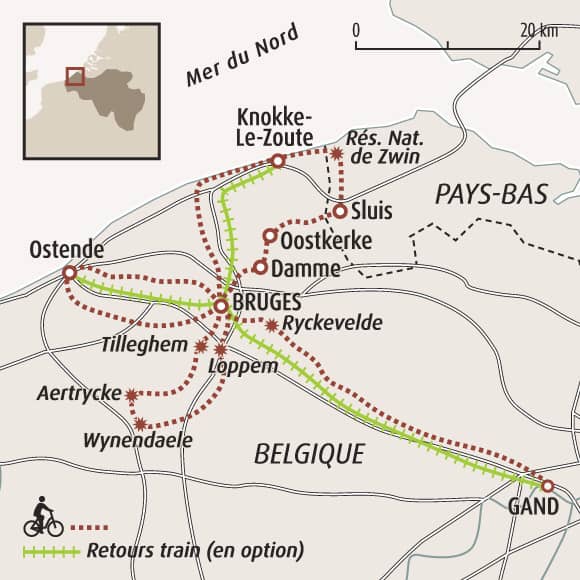 Un séjour à vélo en Belgique pour découvrir la richesse culturelle et gastronomique de la Flandre en empruntant des pistes cyclables sécurisées et des chemins peu fréquentés. L'itinéraire vous mène entre les villes historiques de Bruges et Gand et vous permet de découvrir les perles de la Flandre : canaux pittoresques, polders, plages de sable, cités médiévales et villages typiques. Un séjour autour de Bruges, cette ville médiévale, parmi les plus belles au monde, qui semble figée dans le temps, comme si elle n’avait pas vieilli depuis le Moyen-Âge. Ses nombreux canaux, qui la traversent, lui confèrent un charme unique et lui valent son surnom de « Venise du Nord ». Bien que très touristique, le vieux centre reste suffisamment vaste pour que vous puissiez y plonger dans son atmosphère médiévale et unique en toute tranquillité. Un circuit décliné en étoile et sur plusieurs versions d'hébergements pour explorer la Flandre à votre rythme et selon vos envies.