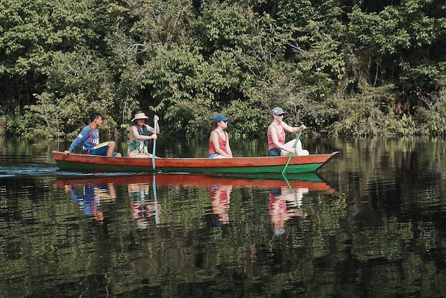 Nous commençons la journée par une exploration du fleuve Ariaú, idéal pour observer la richesse ornithologique de la région. Au fil de la navigation, quelques singes curieux peuvent se laisser apercevoir entre les branches. L’itinérance se poursuit avec un moment fort : la rencontre avec les botos, les dauphins roses emblématiques du Rio Negro. Plus tard dans l'après-midi, nous partons à la pêche aux piranhas pour en apprendre davantage sur ce poisson emblématique de la région. Si la météo le permet, nous terminons la journée en douceur devant le coucher du soleil à l’embouchure du fleuve. Nous concluons la journée, à la tombée de la nuit, en partant observer les "jacarés", les caïmans d'Amazonie.