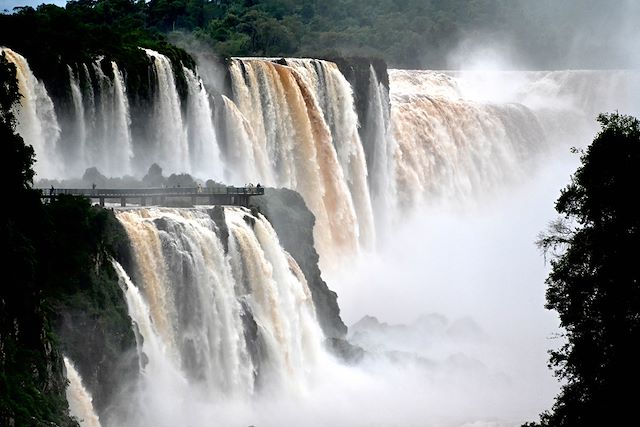 Nous arpentons les passerelles aménagées qui surplombent le fleuve ; au fur et à mesure de notre progression, nous ressentons le souffle grandissant des chutes, et les embruns sont de plus en plus forts (prévoir un K-way ou un poncho de pluie). Depuis le sommet de la chute, nous peinons à voir le bas, tant la brume est épaisse. Nous apercevons par contre ça et là les martinets qui nichent sur les parois, à l'abri des prédateurs. Le reste de la matinée est consacré à arpenter les vastes sentiers du parc argentin qui nous mènent parfois sous les chutes. Nous pouvons prendre un bateau qui nous approche au plus près des chutes, voire même SOUS les chutes... Au cours de la journée, nous aurons l'opportunité d'observer plusieurs espèces qui peuplent la forêt (coatis, singes, aigles, etc...).