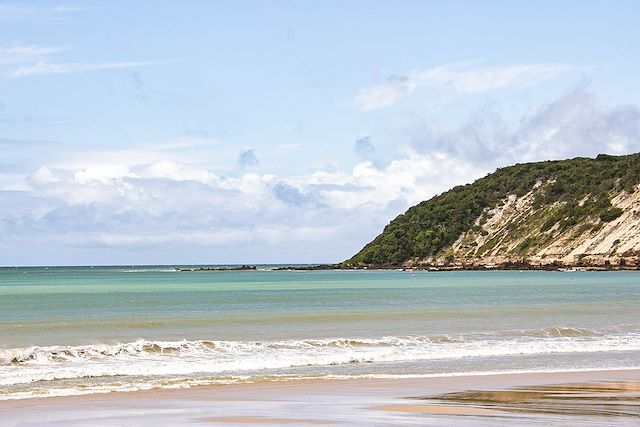Cette première étape commence sous les arbres depuis le village de Laranjeiras. Pour rejoindre Praia do Sono ("la plage du sommeil") nous marchons dans une forêt dense au son des oiseaux. Pas de difficulté sur cette partie. Une fois sur la plage nous déjeunons les pieds dans le sable et profitons d'un moment de détente pour nous rafraîchir dans les vagues ou tout simplement faire une petite sieste. Nous reprenons la marche en début d'après-midi. Le chemin s'élève depuis la plage et sur un sol argileux. Passée cette petite difficulté, nous continuons tranquillement vers le village de pêcheurs de Ponta Negra en longeant les plages Praia da Velha et Praia do Antigos.