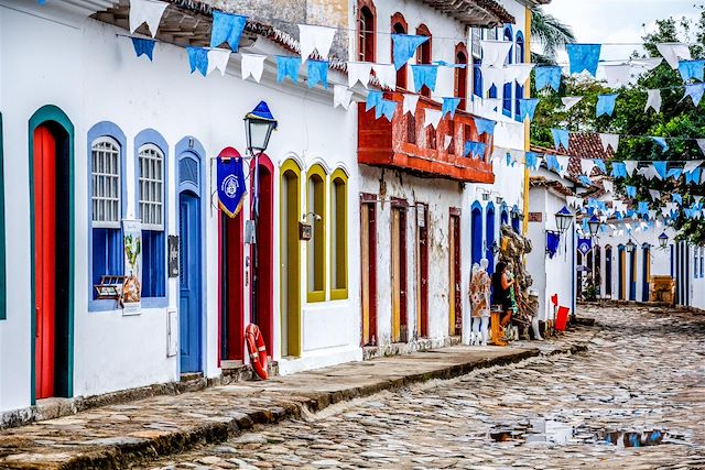 Nichée entre la mer et les premiers contreforts de la Serra do Mar, la ville de Paraty abrite l’un des plus beaux héritages coloniaux du Brésil, classé au patrimoine mondial par l’Unesco. Au fil des ruelles pavées, nous découvrons ce legs exceptionnel, témoignage des fastes des XVIIe et XVIIIe siècles. Sublimes demeures, 4 superbes églises baroques, dont Santa Rita de Cassia qui héberge aujourd’hui un musée d’art sacré. Le port de Paraty s'est construit suite à la découverte de gisements d'or et de diamants dans le Minas Gerais. Sa fonction était alors d'acheminer ces richesses vers le Portugal. La ville présente encore de nombreux témoignages maçonniques au travers des peintures et des structures des maisons qui avaient pour but d'informer sur la nature des personnes habitant le lieu. A marée haute, l'eau investit les rues du centre-ville, ayant ainsi pour avantage de nettoyer les rues qui sont alors fermées à la circulation.