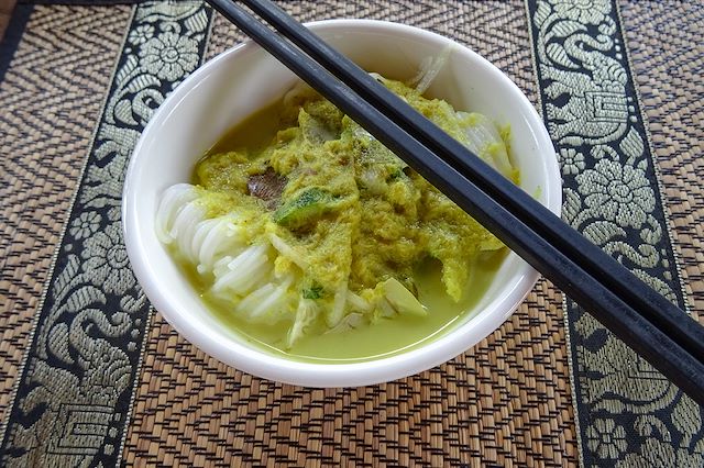 La cuisine cambodgienne est très influencée par les traditions thaïlandaises et laotiennes voisines. Elle présente heureusement quelques saveurs locales. Le riz constitue la base de l’alimentation. Un repas cambodgien comporte presque toujours une soupe (ou Samla), servie en même temps que les autres plats. Les Cambodgiens consomment beaucoup de poissons, pêchés dans le lac Tonlé Sap. Le plus souvent, le poisson est découpé en morceaux roulés dans une feuille de laitue ou d’épinard puis trempés dans une sauce au poisson. Les salades cambodgiennes, parfumées à la coriandre, aux feuilles de menthe et au thym citronné, sont délicieuses. On déguste des nouilles de riz ou Khao Phoune à tous les coins de rue.