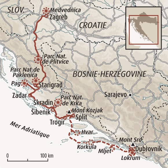 Ce roadtrip en liberté vous invite à traverser la Croatie du nord au sud, de Zagreb à Dubrovnik, au fil d’un itinéraire mêlant randonnées accessibles, villes et paysages. Au volant de votre véhicule de location, vous explorez les plus beaux parcs nationaux du pays : Medvednica, Plitvice, Paklenica, Krka et Mljet, entre forêts, gorges, cascades et panoramas côtiers. Le voyage alterne balades et randonnées modulables, baignades dans l’Adriatique, excursions en bateau et temps libres pour découvrir les joyaux culturels croates. Les traversées maritimes vers les îles dalmates ajoutent une touche d’évasion, entre sentiers sauvages, criques secrètes et villages de caractère. Un cocktail d'aventure, de détente et de découvertes culturelles au cœur des paysages croates !