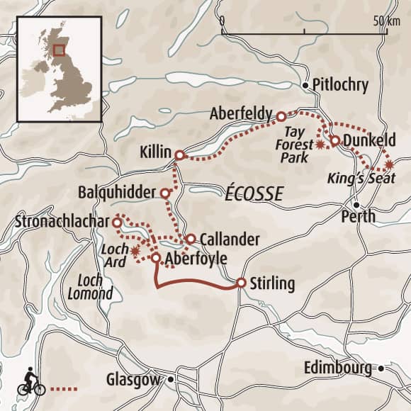 Aujourd’hui vous pédalez dans une région différente, faite de paysages agricoles et forestiers. Vous commencez par suivre une ancienne voie ferrée pittoresque offrant des vues fantastiques sur les Trossachs et qui vous mène au-dessus du col de Leny. Une combinaison de routes tranquilles, de pistes cyclables et d’une ancienne voie de chemin de fer jusqu’à Glen Ogle. Vous longez le loch Lubnaig, traversez la forêt de Strathyre et passez par le village de Balquhidder, où se trouve la tombe de Rob Roy MacGregor, le Robin des Bois écossais. Votre étape se finit par une jolie portion forestière avant de rejoindre Killin où vous passez la nuit. Une fois arrivés à Killin profitez d'une collation près des chutes de Dochart et d'une balade sur la berge du beau loch Tay.