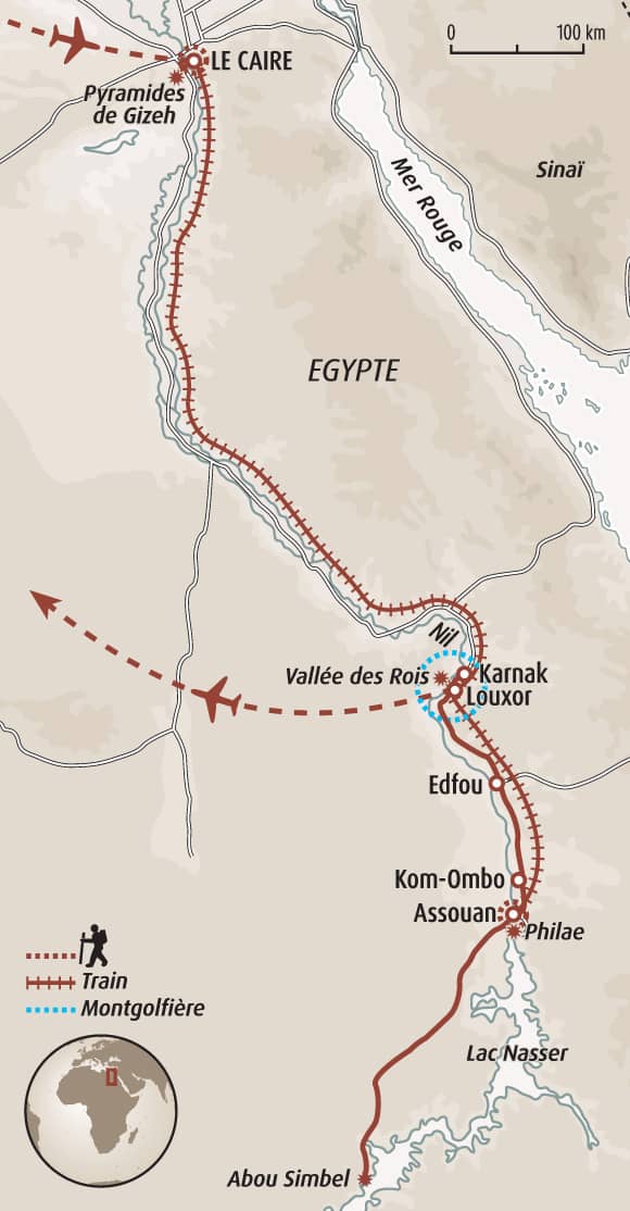 Votre aventure débute au Caire, entre la splendeur éternelle des pyramides de Gizeh et la modernité du tout nouveau Grand Egyptian Museum. Puis cap vers le sud : laissez-vous émerveiller par la magie d’Abu Simbel avant de remonter le Nil jusqu’à Louxor, véritable musée à ciel ouvert. le temps d’un voyage à travers l’Égypte éternelle. De la capitale et ses géants de pierre à la Nubie, royaume du désert, jusqu’à l'ancienne Thèbes, chaque étape dévoile un fragment de légende.