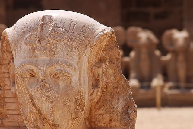 Puis profitez pleinement de votre journée avec votre chauffeur privatif pour découvrir le majestueux temple de Karnak, véritable labyrinthe de colonnes et d’histoire. Flânez ensuite le long de l’Allée des Sphinx, voie sacrée qui relie cette merveille au temple de Louxor, joyau de l’Égypte antique (guide en supplément, nous consulter).