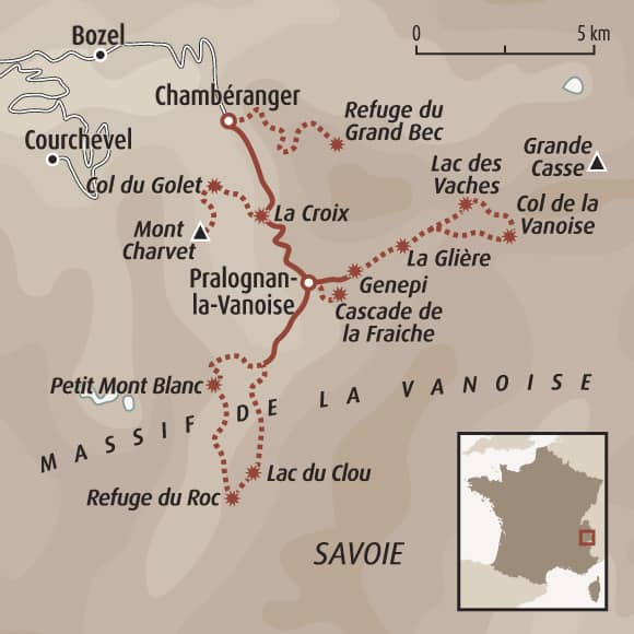 Basés à Pralognan-la-Vanoise, au cœur du parc national de la Vanoise, nous explorons chaque jour de nouveaux sentiers en étoile. L’itinéraire mène vers des lacs d’altitude, des balcons panoramiques et des paysages tour à tour minéraux et verdoyants. Le format offre une vraie liberté de tempo, avec la possibilité de ralentir et de se reposer à l’hôtel. Le séjour se conclut par un mini-trek de deux jours, pour goûter à l’itinérance entourés des sommets emblématiques de la Vanoise.