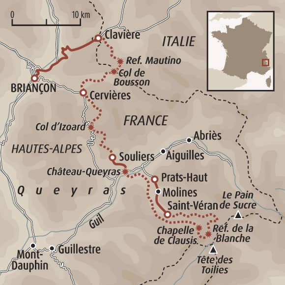 Depuis le refuge de Souliers, départ pour le lac de Roue et une descente sur piste jusqu’à Arvieux. Nous rejoignons ensuite le fameux col de l’Izoard, passage mythique du Tour de France et frontière entre le Queyras et le Briançonnais. Longue descente sur le village de Cervières.