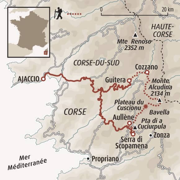 Randonner en Corse, c’est choisir un voyage où nous avançons au rythme des montagnes et des villages qui les habitent. Ce séjour s’adresse à celles et ceux qui aiment marcher, partager et ressentir un territoire de l’intérieur. Depuis Serra di Scopamena, nous nous élancions vers la Punta di a Cuciurpula puis gagnons le plateau du Cuscionu, espace vivant où circulent troupeaux et lumière d’altitude. Nous gravissons le Monte Alcudina avant de descendre vers Cozzano et Guitera, entre sentiers du GR20 et Mare a Mare. Une itinérance simple, engagée, nourrie de rencontres et d’instants paisibles en gîte ou en bergerie.