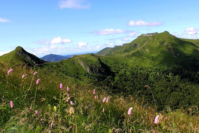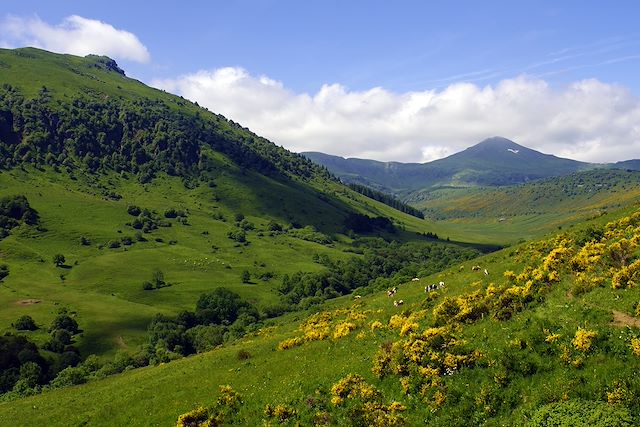 Une grande journée dans le désert vert nous attend aujourd'hui. Nous commençons avec la traversée de la vallée de La Rhue et la montée vers le vaste plateau volcanique du Cézallier. La première partie de la journée longe une petite vallée boisée avant que le paysage s'ouvre sur les pâturages d'estive peuplés de milliers de têtes de bétail. De petits hameaux en burons, nous traverserons ce territoire rappelant la Mongolie, herbeux, vert, d'où émane une impression d'immensité. En fin de journée, descente vers le village de Pradiers, puis vers Allanche, la capitale du Cézallier.
