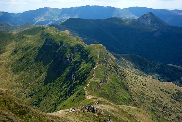 Après être monté au col de Serre, nous traversons le stratovolcan du Cantal par la partie où se trouvent ses plus beaux sommets : la vallée de l'Impradine, le cirque d'Eylac et la brèche de Rolland, le Puy Mary, le Puy de Peyre Arse et le Puy Griou. Possibilité de faire l'ascension du Puy Griou avant de descendre vers le col de Font de Cère et/ou Super Lioran.