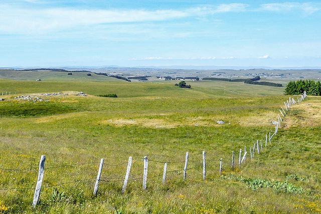 Le paysage change autour de nous, les arbres disparaissent, laissant place aux pâturages ouverts à perte de vue. Nous continuons de longer la vallée du Bès en traversant de nombreux petits hameaux jusqu'à Nasbinals, le village emblématique de ce haut plateau à 1200 m d'altitude.