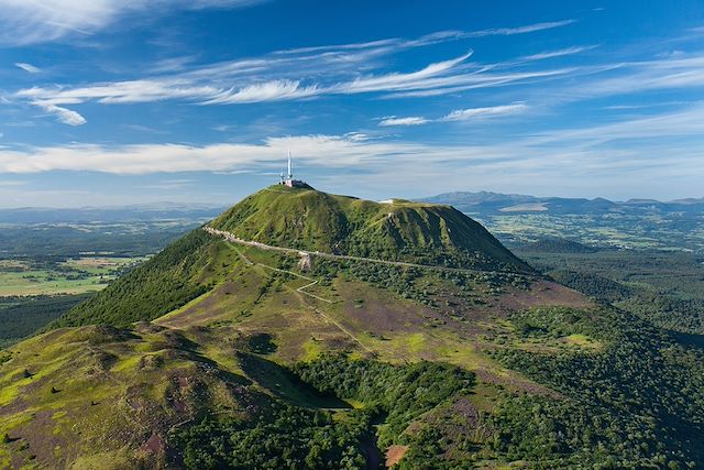 Transfert en bus pour sortir de la ville jusqu'à La Font de l'Arbre. Montée vers le Puy de Pariou au cratère parfait, c'est lui qui a servi de décor pour les eaux de Volvic (ascension possible par le sentier aménagé coté sud en aller / retour). Poursuite vers le Puy de Dôme, sommet emblématique de la chaîne des Puys. Le panorama y est exceptionnel par beau temps ! On peut également y visiter les vestiges du temple de Mercure, ainsi l'exposition permanente sur le volcanisme en Auvergne. Descente par l'ancien chemin muletier et par le col de Ceyssat vers le village de Laschamps.