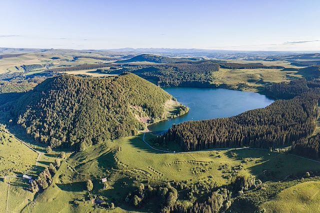 Aujourd'hui, nous effectuons une traversée du piémont sud du Sancy par les lacs Pavin et Chauvet, deux des grands lacs d'origine volcanique parsemant les volcans d'Auvergne comme autant de miroirs à la circularité quasi parfaite. Le paysage s'ouvre sur le versant sud du Sancy et laisse apercevoir les prémices du Cézallier au loin.