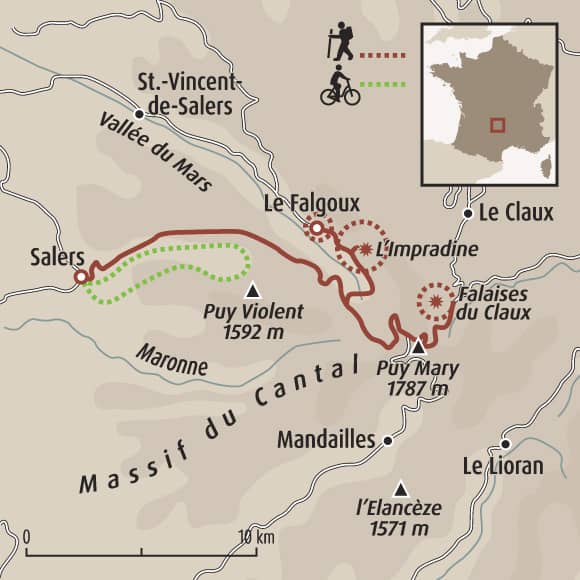 Au départ de Salers, nous partons pour une boucle VTT accessible à tous. Nous empruntons une ancienne piste forestières en direction de la vallée de la Maronne et du pied du Puy Violent. Le parcours alterne entre forêts, pâturages et superbes panoramas sur les paysages volcaniques. Pause pique-nique au bord d'un ruisseau, avec la possibilité d'une baignade rafraîchissante avant un retour tranquille dans l'après-midi.