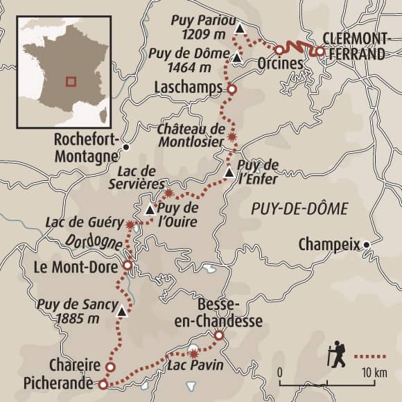 Ce premier tronçon de notre grande traversée du Massif Central vous emmène au cœur de l'Auvergne en partant de Clermont-Ferrand. La chaîne des Puys, d’origine géologique récente, aligne ses cônes volcaniques de type strombolien, tandis que le massif du Sancy, plus ancien et de nature explosive, raconte une autre page de l’histoire volcanique. Cette région offre de vastes paysages, une nature préservée et une vie pastorale encore bien ancrée. Terre du Saint-Nectaire, des plantes médicinales et des lacs de cratères, elle incarne toute la richesse naturelle et humaine de l’Auvergne.