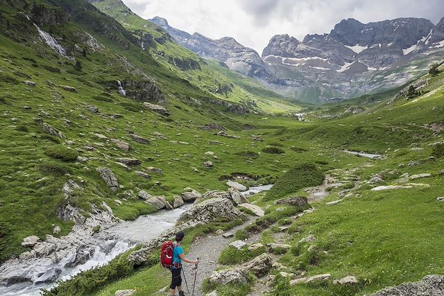 Emblème des Pyrénées, le cirque de Gavarnie est notre porte d’entrée pour une itinérance transfrontalière spectaculaire. En 6 jours de marche, avec un portage du sac allégé, la randonnée permet de découvrir les impressionnants cirques glaciaires de Gavarnie, Troumouse et Estaubé. Nous passons ensuite en Espagne afin de parcourir la vire majestueuse de "Faja Pelay", belvédère privilégié pour contempler les méandres du Grand Canyon d’Ordesa au pied du mont Perdu. Les hardes d’isards escaladant les parois calcaires, les lacs asséchés depuis des milliers d’années et les falaises calcaires vertigineuses confèrent à ce séjour une ambiance grandiose, où la haute montagne flirte avec les plateaux verdoyants parsemés de ruisseaux où paissent les grands troupeaux de brebis. Sans nul doute, une des randonnées incontournables des Pyrénées.