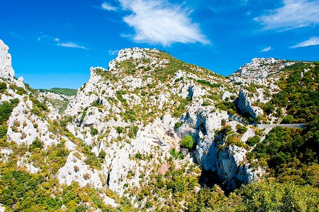 Nature sauvage, crêtes calcaires, pentes couvertes de garrigue odorante, bosquets ombragés contrastent avec l’aspect plus ordonné du vignoble de la vallée.