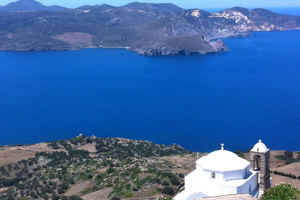 Île de Sifnos, côte sud-est : églises Panagia Poulati et Chrissopigi, villages de Kastro et Faros