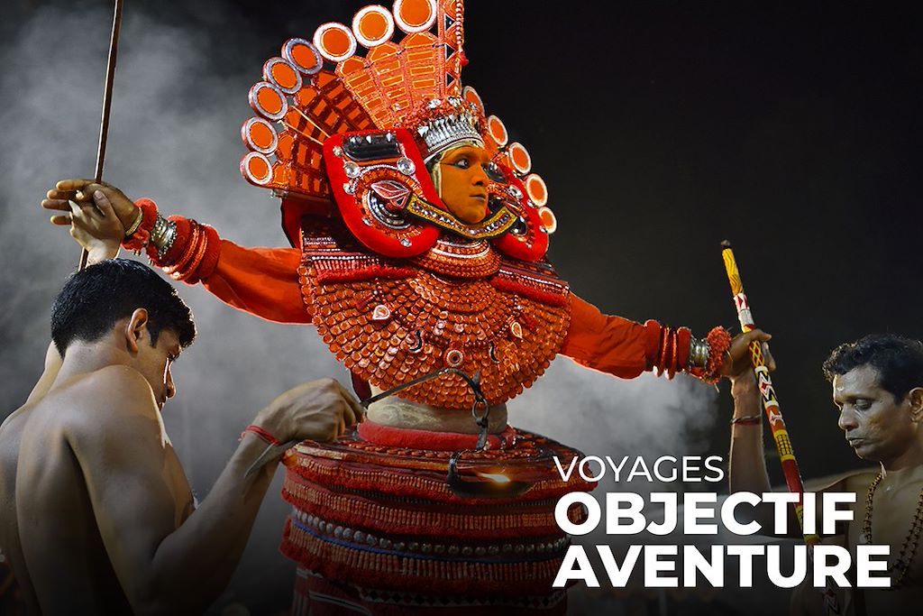 Igor Klimenko, guide spécialiste passionné de l’Inde, nous invite à vivre intensément deux des traditions les plus sacrées du sud de l’Inde : les Theyyams et le Pooram. Ici, au cœur du Kerala, les Theyyams perpétuent chaque année des rites envoûtants, à la croisée de la magie, de la transe et du théâtre. Durant plusieurs nuits, dans les petits temples des villages, nous assistons à ces cérémonies mystiques où des hommes deviennent dieux, dans un tourbillon de couleurs, de danses et de percussions. Une expérience saisissante, où art et spiritualité se mêlent pour offrir un moment d’une intensité rare. À la même période, les Poorams marquent la fin des récoltes et l’arrivée de la saison chaude. A Thrissur, cœur culturel du Kerala, nous vivons l'intensité du Pooram d’Uthralikavu, dédié à la déesse Kali. Processions d’éléphants caparaçonnés, musiques rituelles et ferveur populaire composent un spectacle d’une énergie inoubliable. Notre voyage se poursuit dans les backwaters, ce dédale de canaux bordés de cocotiers, villages et rizières, où la vie s’écoule paisiblement. L’expérience devient encore plus intime lors de nos étapes en maison d’hôte, à la rencontre de familles qui perpétuent des traditions ancestrales telles que le Kathakali, théâtre dansé millénaire. Nos balades à pied ou en bateau nous plongent au cœur d’une nature préservée, notamment dans la réserve naturelle de Parambikulam, véritable sanctuaire de biodiversité. Enfin, pour clore ce voyage en beauté, nous faisons halte à Cochin pour découvrir la Biennale de Kochi, le plus grand festival d’art contemporain d’Asie. Entre installations audacieuses et échanges entre artistes indiens et internationaux, l’art contemporain dialogue avec les traditions locales, transformant la ville en un véritable musée à ciel ouvert. Un voyage d’exception, au plus près de l’âme du Kerala, entre traditions millénaires et modernité vibrante.
