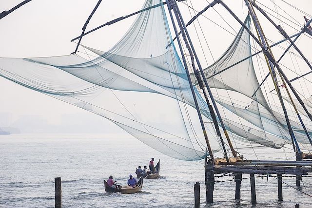 Arrivée à Cochin et installation dans notre hébergement situé à Fort Cochin, dans le centre colonial. Déjeuner libre et temps de repos avant le début de nos visites. Ancien port réparti sur plusieurs îles, Cochin a joué un rôle important dans le commerce des épices, fréquenté par des marchands portugais, hollandais et britanniques. Nous flânons dans la vieille ville et sur le front de mer, du côté des célèbres "carrelets chinois" (grands filets de pêche) à l’entrée du port où les pêcheurs vendent directement le poisson dans de petites échoppes. Selon le temps, nous découvrons les différentes influences de la ville dans le quartier colonial : les faïences de Canton, les tuiles méditerranéennes, les églises syriaques, le Dutch Palace ou l'église St Francis...
