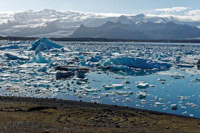 Le matin, nous partons vers la lagune glaciaire de Jökulsárlón. Le site est très récent : au milieu du XX? siècle, le front du glacier s’est retiré, laissant place à une étendue mouvante, où dérivent des blocs de glace, portés par le courant jusqu’à l’océan. Le paysage s’anime au rythme des vents et des marées. Les sternes arctiques habitent les alentours, et quelques phoques croisent dans le chenal. Nous déambulons entre éclats de glace et sable noir, dans une promenade singulière. Nous ressentons cette touche d’Arctique, cette première porte qui s’ouvre vers les terres polaires.