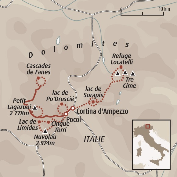 Ce voyage naît d’une envie simple : randonner au cœur d’un massif sculpté pour le mouvement. Il s’adresse aux marcheurs motivés, en quête de panoramas lumineux et d’engagement mesuré. Depuis Cortina d’Ampezzo, l’itinéraire rayonne vers les lacs, crêtes calcaires et vallées où se croisent cultures italienne et autrichienne. Chaque journée ouvre une nouvelle perspective, un sentier abrupt, une lumière changeante. Puis vient le retour, lové dans un hôtel en lisière d’une forêt centenaire, où calme et nature reprennent le tempo. Pour un itinéraire plus accessible, une autre version existe ITAL51.