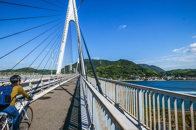 Départ pour une itinérance de deux jours à vélo sur la piste cyclable du Shimamani Kaido. Vous laisserez Imabari derrière vous pour parcourir les 37 kms qui relient plusieurs îles via des ponts suspendus. La vue sur l'océan lors de la traversée de la mer de Seto reste inoubliable. En chemin, vous pourrez visiter des temples et des sanctuaires afin de vous dégourdir les jambes.