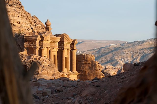 Après la visite, nous débutons notre randonnée en direction de Pétra par un chemin peu fréquenté offrant des points de vue sur le wadi Araba, le mont Aaron et son petit mausolée blanc. Au détour d'un rocher, nous arrivons enfin sur le spectaculaire monastère (Al-Deir), aux dimensions imposantes. Direction la ville basse en empruntant les 800 marches pour rejoindre le Qasr Al-Bint, le grand temple, l'église byzantine et les tombeaux royaux.