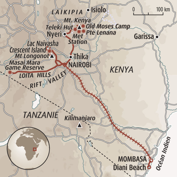 Sur la première partie de l'itinéraire (à savoir l'ascension du Mont Kenya), vous pourrez être regroupés avec des participants inscrits sur le séjour "Ascension du mont Kenya" (KEN018), sur le séjour "Du toit du Kenya aux terres des Big Five" (KEN023), "DDu Mont Kenya aux plages de l’océan Indien" (KEN022).