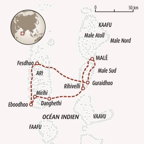 L’équilibre écologique des régions que vous allez traverser est très précaire. La permanence des flux touristiques, même en groupes restreints, le perturbe d’autant plus rapidement. Le gouvernement maldivien a appliqué plusieurs politiques environnementales pour la protection des territoires terrestres et marins. Cependant, beaucoup de travail reste à accomplir, notamment dans la gestion des zones côtières afin de protéger les récifs coralliens et les côtes. Notre partenaire local est sensibilisé à la protection de cet écosystème naturel aussi fragile que vulnérable. Nos guides, passionnés, veillent au bon déroulement du voyage mais sont aussi particulièrement sensibles à la protection de l'environnement. Nous essayons lors de nos cabotages de respecter au maximum les lieux que nous visitons afin d’en protéger leur intégrité.
