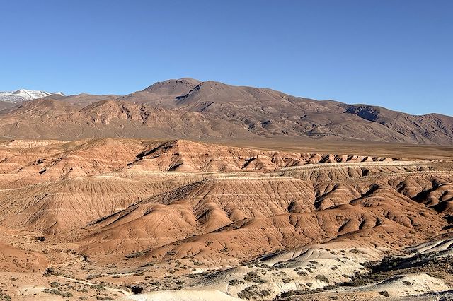 Voyager ici, c’est accepter de ralentir pour laisser le désert et les montagnes donner le tempo. Ce séjour s’adresse à celles et ceux qui pratiquent le vélo et souhaitent vivre une aventure accessible, progressive et profondément dépaysante dans le Sud marocain. Depuis Ouarzazate, nous gagnons la palmeraie de Skoura, immense oasis paisible où s’entrelacent cultures, kasbahs et chemins sablonneux. Les jours suivants, l’itinéraire s’élève doucement vers les hauts plateaux, vastes étendues minérales dominées par les sommets du Haut Atlas, fréquentées par les nomades en transhumance. Le silence, la lumière et l’espace accompagnent nos roues. La descente vers la vallée des Roses marque un changement d’ambiance : cultures en terrasses, kasbahs de pisé et villages vivants rythment la progression jusqu’aux gorges et canyons sculptés par l’eau.