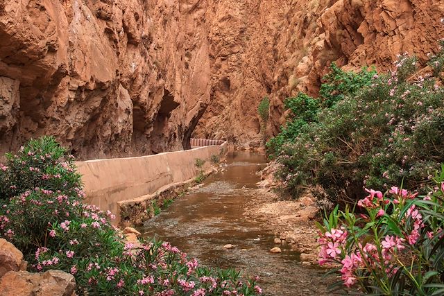Nous entrons dans la vallée des Roses, alimentée toute l’année par l’oued M’Goun qui descend du Haut Atlas. Le cirque de Boutagharar offre des formations rocheuses remarquables, avant que nous suivions le cours de l’oued au cœur de cultures en terrasses. Les haies de roses de Damas bordent les champs et parfument l’air au printemps. Les kasbahs de pisé rythment la descente de la vallée jusqu’au village de Taberkhacht, dominant les méandres de la rivière.