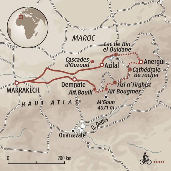 Nous quittons Marrakech de bonne heure pour rejoindre l’Atlas central. La route traverse Demnate, le pont naturel d’Imi n’Ifri, puis franchit plusieurs cols avant d’atteindre les villages berbères d’altitude. Après le déjeuner, nous enfourchons les vélos pour une première mise en jambe : une belle descente ouvre sur la vallée des Aït Bouali, suivie d’une remontée progressive vers la vallée heureuse des Aït Bougmez.