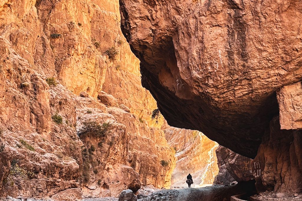 Nous faisons une halte à quelques pas du site naturel d’Imi’n’Ifri, la «?bouche de l’ogre?», un pont naturel sous lequel s’engouffre la rivière. Cette étape, variée et très agréable sur une petite route de montagne asphaltée, nous offre un panorama riche et diversifié à chaque coup de pédale.