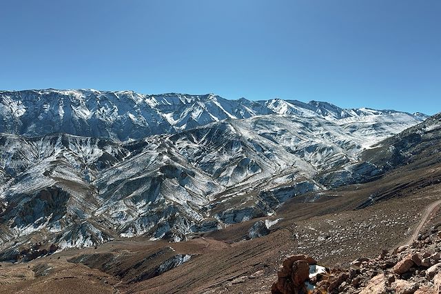 À la confluence de l’Assif Melloul et de l’Assif Ahançal, deux options se présentent : un itinéraire très sauvage, accidenté, réservé aux mollets avertis*, ou une petite route asphaltée, plus longue mais accessible, qui grimpe également pour rejoindre notre bivouac via Zaouia Ahançal. Nous passerons la soirée et la nuit derrière le col de Tizi’n’Ilissi (2?603?m), sur le plateau du haut pâturage d’Igherm’n’Talmest (2?275?m), auprès de la source.