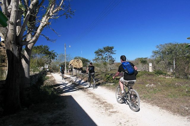 Départ pour Ek Balam, le "jaguar noir" en maya. Les fouilles entreprises il y a une vingtaine d’années ont révélé une architecture monumentale et des sculptures flamboyantes qui font de ce site une découverte archéologique majeure. Nous le visitons avant de pédaler jusqu’à un joli "cenote", grand bassin naturel typique du Yucatán. Encaissé à 15m de la surface et protégé par d’imposantes parois calcaires d’où tombent racines et cascade, le cenote prend des colorations turquoise lorsque la lumière y pénètre. Nous nous baignons et profitons selon nos envies de la tyrolienne et du rappel. Déjeuner et poursuite des visites avec la communauté d’Ek Balam que nous découvrons en observant un atelier de fabrique artisanale de hamacs, véritable institution locale. Dîner et nuit dans la communauté qui propose un hébergement maya typique.