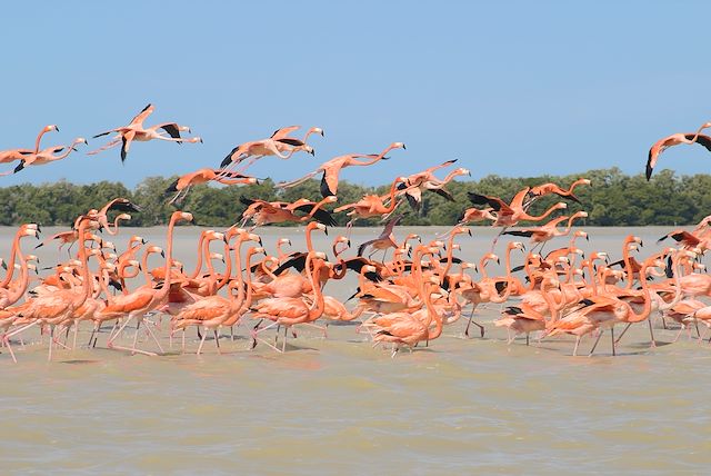 Route vers l’ouest, et traversée de quelques villages mayas typiques avant de nous enfoncer dans la nature préservée du refuge faunique de Celestun, zone principale d’alimentation du flamant rose et autres oiseaux aquatiques. Arrivée dans ce pittoresque petit port de pêche et départ en barque à moteur dans l’estuaire de Celestun vers les marais salants pour observer les colonies de flamants roses, hérons, pélicans, frégates, etc… Ce véritable sanctuaire naturel offre un spectacle prodigieux. Retour sur la terre ferme pour le déjeuner. Détente et baignade dans le golfe du Mexique avant de retourner à Mérida dans l’après-midi pour une visite de la ville. Capitale du Yucatán, Mérida a conservé, grâce à la présence de nombreux édifices coloniaux et d’agréables petites places ombragées, son charme colonial. Fin de journée libre pour une découverte personnelle de la ville.