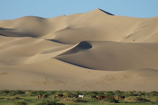 Nous empruntons une belle piste sauvage qui traverse Zoolongiyn nurru ("la montagne tendre") jusqu'à la plaine de Gyalaan Tal, puis longeons le massif pour atteindre les premières dunes où nous pique-niquons. Promenade à pied pour admirer la vue spectaculaire sur le bassin et les contrastes saisissants entre les montagnes et le désert. Nous installons notre camp au pied des grandes dunes de Khongoryn els, surnommées les "dunes chantantes".