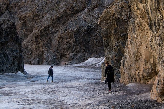 Nous randonnons dans le canyon de Yoliin Am, très encaissé et dont la rivière est gelée la majeure partie de l'année. Nous continuons par une piste à travers le massif de Gurvan Saikhan et débouchons par un étroit corridor sur l'immense plaine de Chandmany.