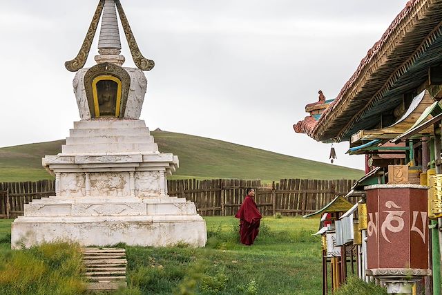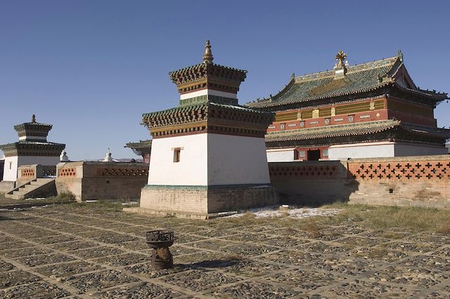 Nous visitons le monastère d'Erdene Khamba qui date du XVIIe siècle et se trouve au pied de la montagne Khögnö Khan. Nous en profitons pour faire une courte randonnée dans ce décor semi-désertique.