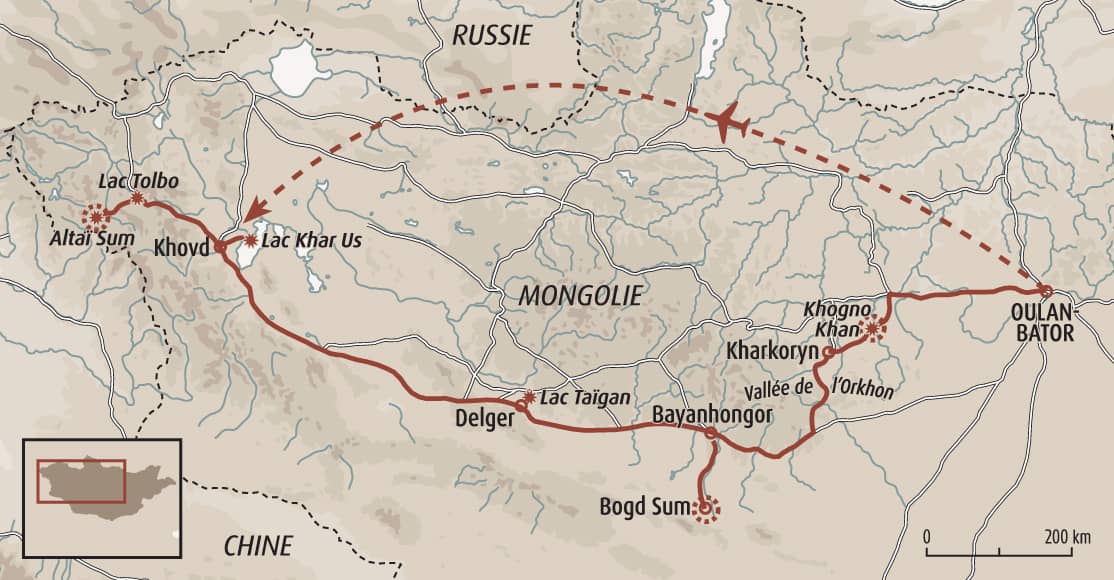 NB : en cas d'annulation du vol pour Khovd, nous prendrons celui pour Ulgii. En cas de retard du vol domestique, il se peut que nous passions la nuit dans une autre zone, et nous rendions le lendemain à notre étape d'Altaï sum sans passer par le lac Tolbo.