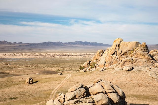 Notre dernier jour de trek se poursuit plein nord. Nous nous engageons dans une gorge, dont nous suivons le tracé qui serpente à travers le massif pour déboucher au nord sur la grande plaine et le lac Orog. Le véhicule peut nous récupérer à la sortie de la gorge pour nous ramener au camp de Ganaa, ou nous pouvons terminer à pied à travers la plaine (marche supplémentaire 8km, -250m, environ 2h à 2h30).