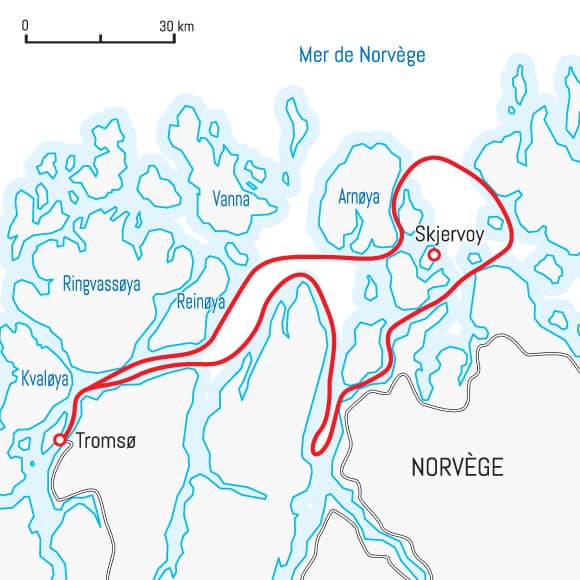 Les 3 jours suivants, nous naviguons le long de la côte de Skjervoy. Cette région est appréciée pour ses sommets accidentés qui plongent directement dans la mer, la richesse de sa faune et sa faible pollution lumineuse qui offre d’excellentes conditions pour l’observation des Aurore boréale. Pendant la navigation, observez les orques et les baleines qui chassent dans cette région.